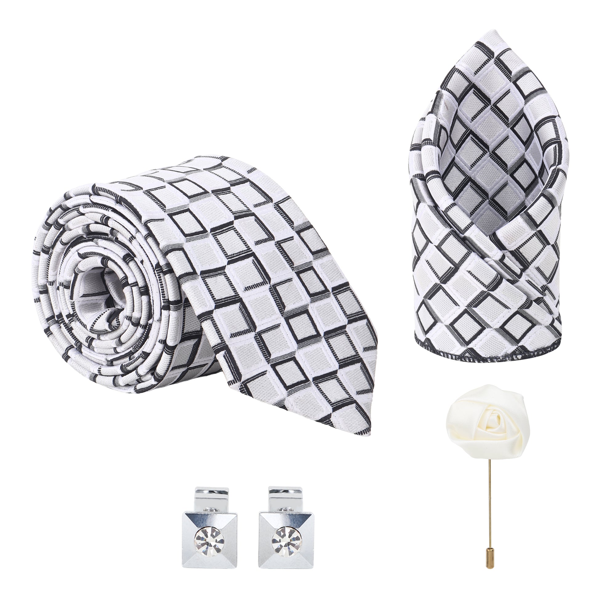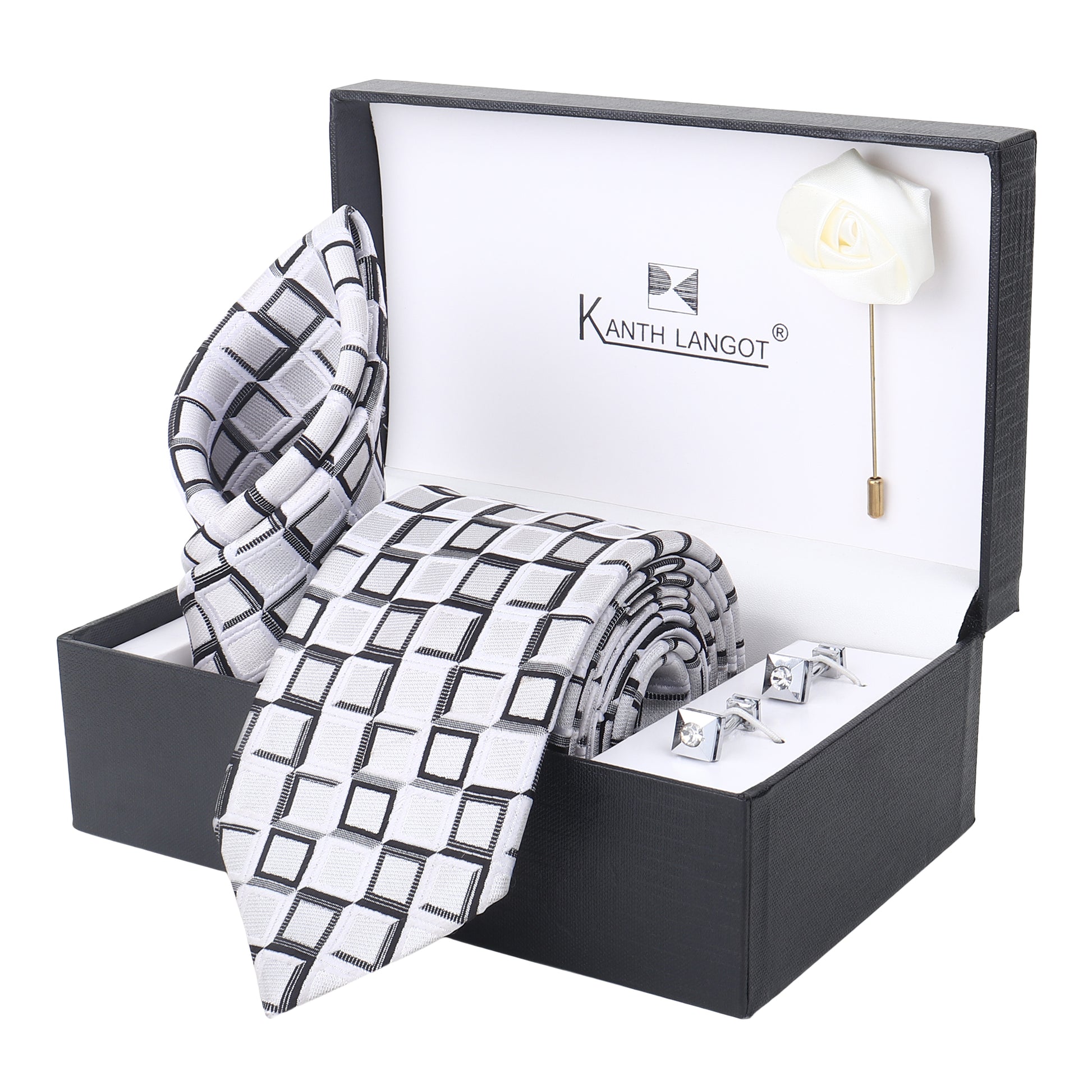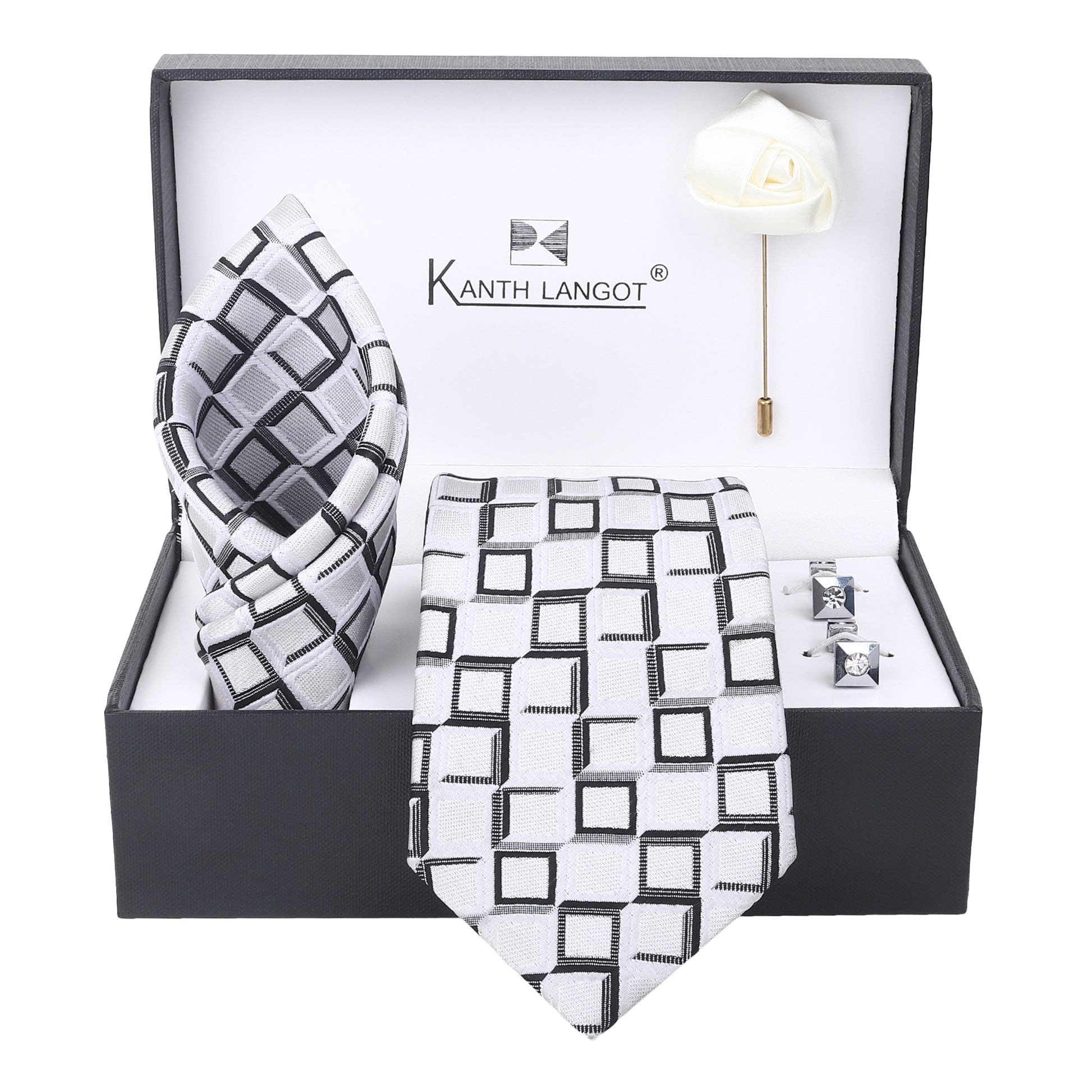 Kanthlangot White Grid Pattern Necktie Gift Set – Tie, Pocket Square, Cufflinks & Lapel Pin
