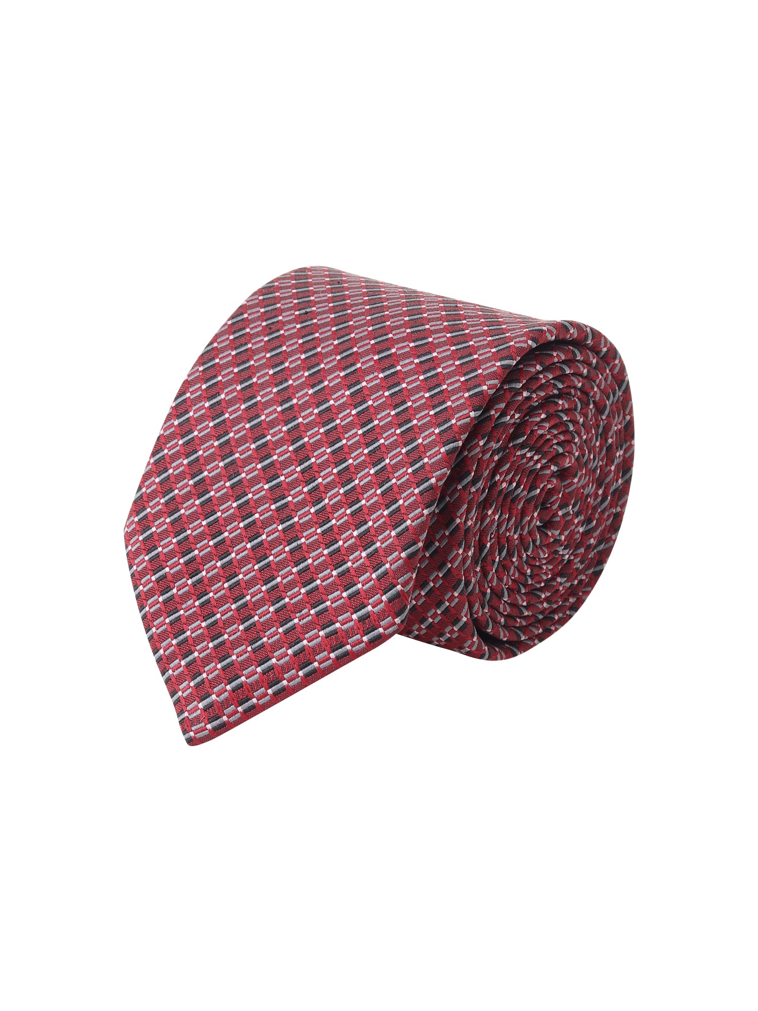 Enhance your formal attire with the Kanthlangot Red & Grey Textured Checkered Silk Necktie, a refined accessory designed for the modern gentleman. Featuring a rich red base interwoven with grey and white checkered details, this tie boasts a sophisticated geometric pattern that adds depth and texture to any outfit. The premium woven silk fabric provides a luxurious sheen and smooth feel, ensuring both style and comfort.