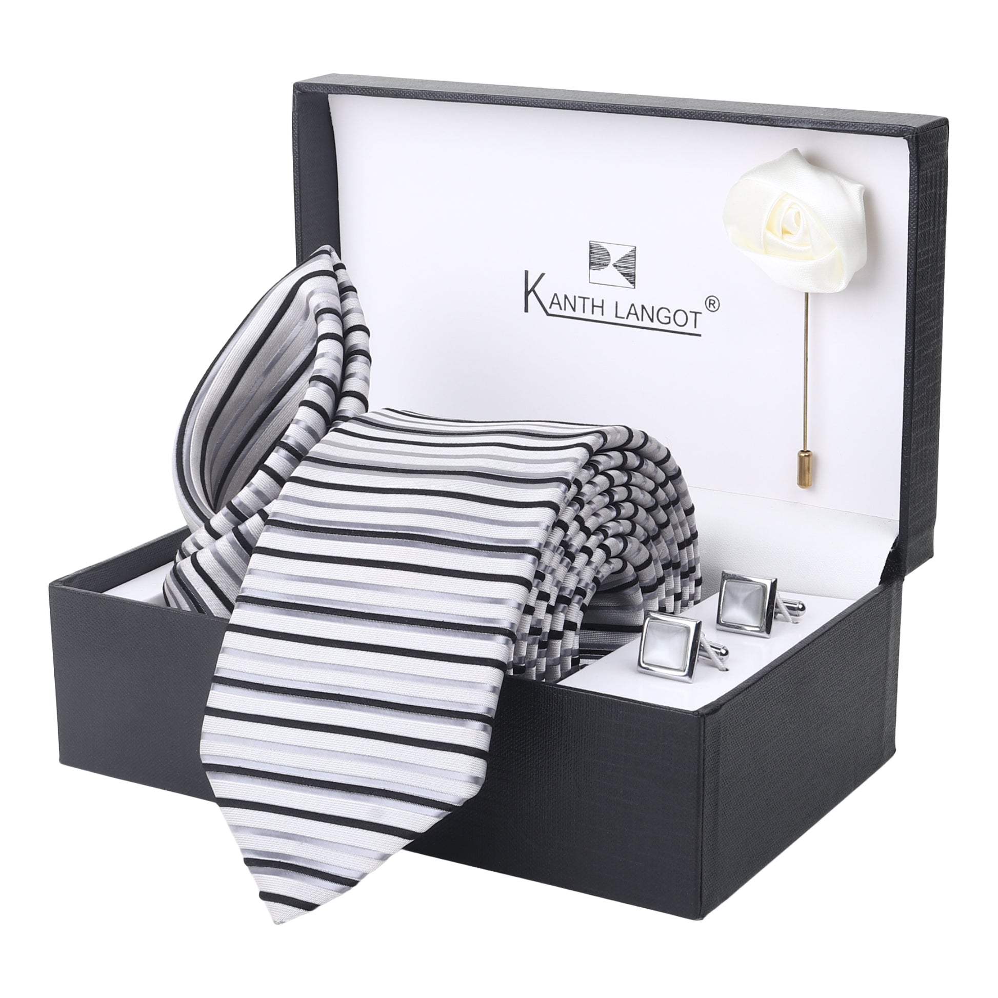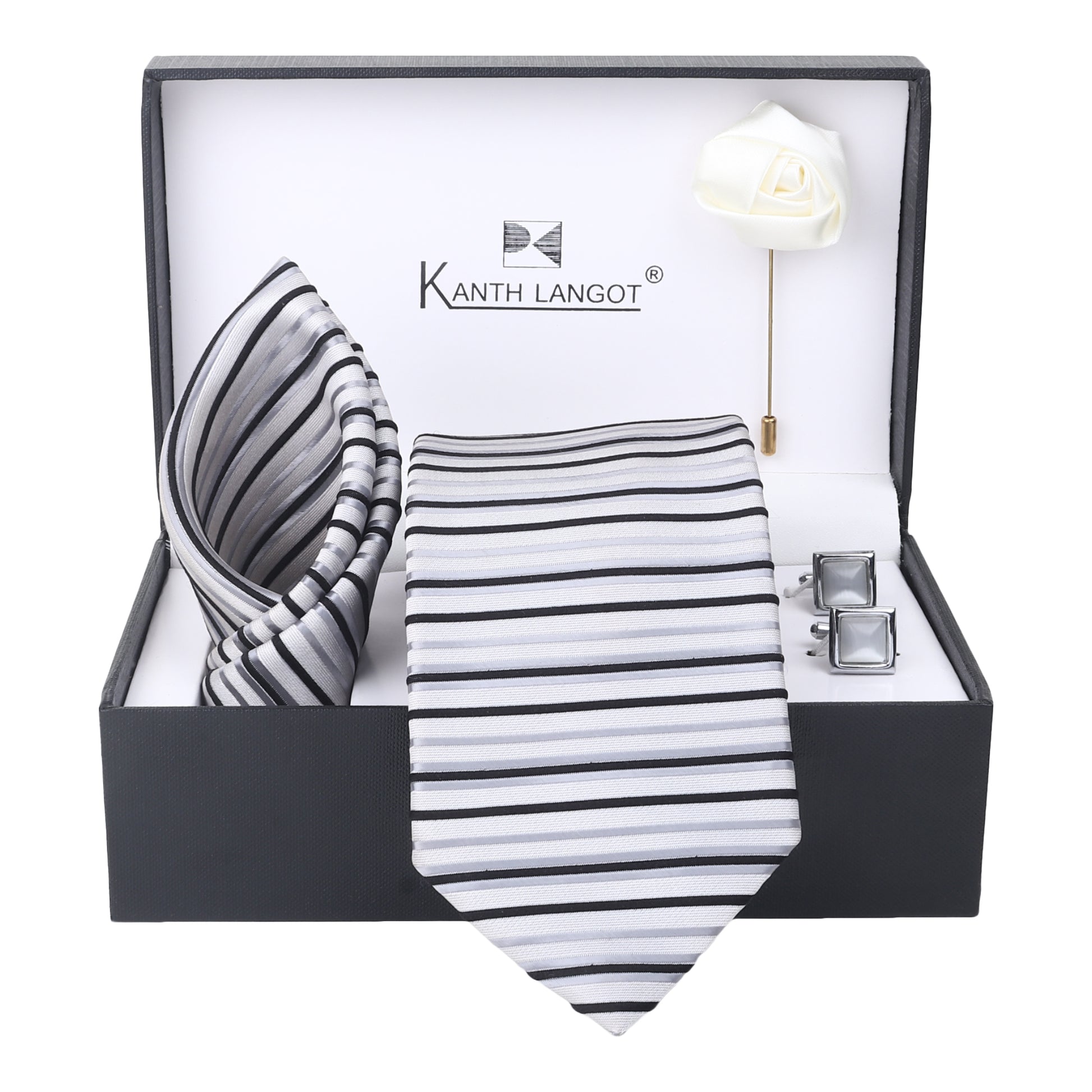 Add timeless elegance to your formalwear with this refined 4-piece accessory set from Kanthlangot. Featuring a silver striped tie, matching pocket square, sleek silver square cufflinks, and a white satin lapel rose, this curated set arrives in a beautifully crafted premium gift box.
