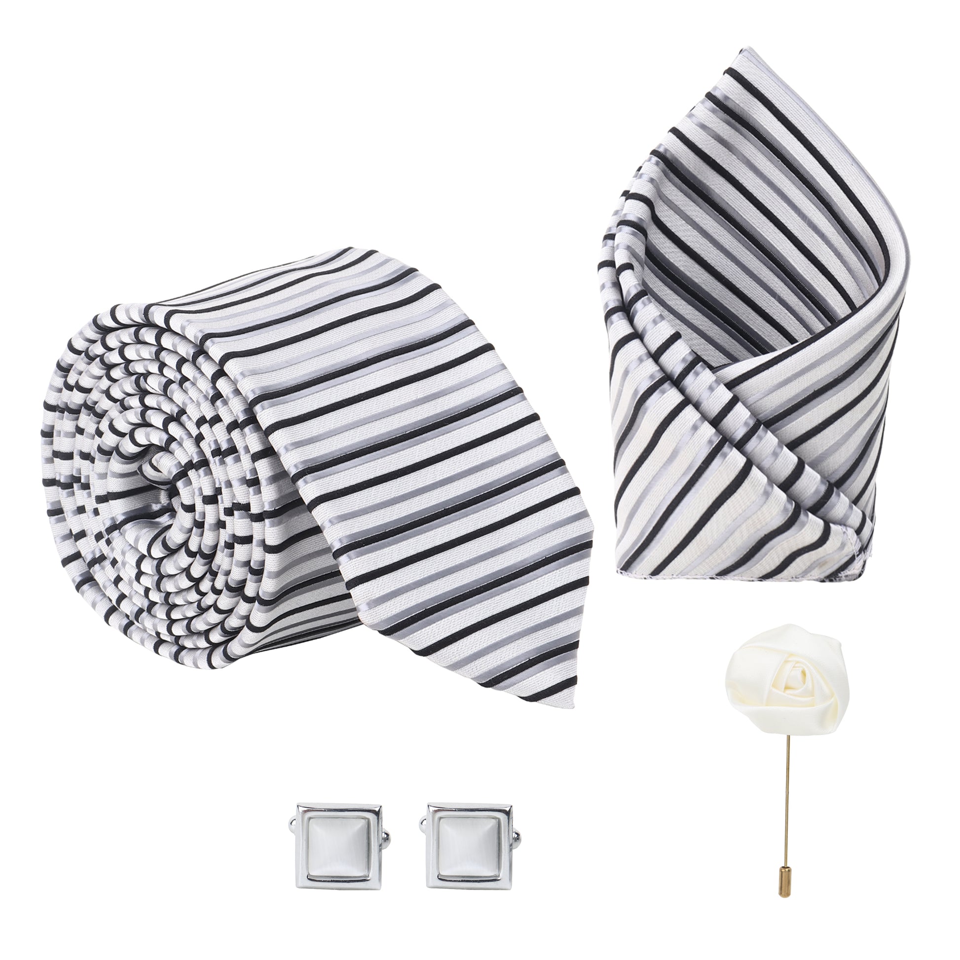 Kanthlangot Set of 4: Silver Stripe Tie, Pocket Square, Silver Cufflinks & White Lapel Rose