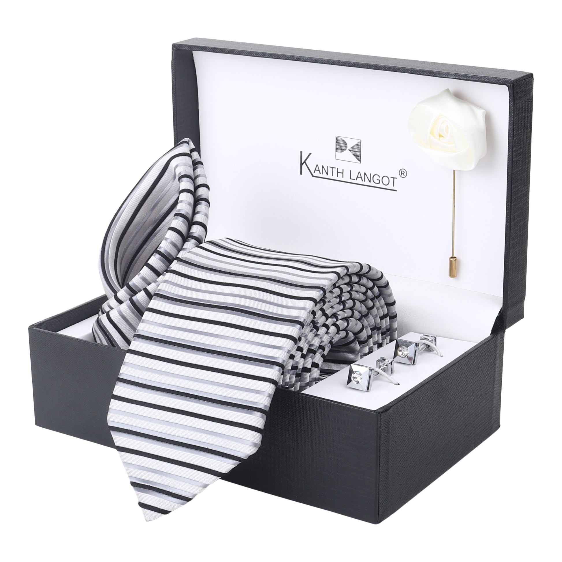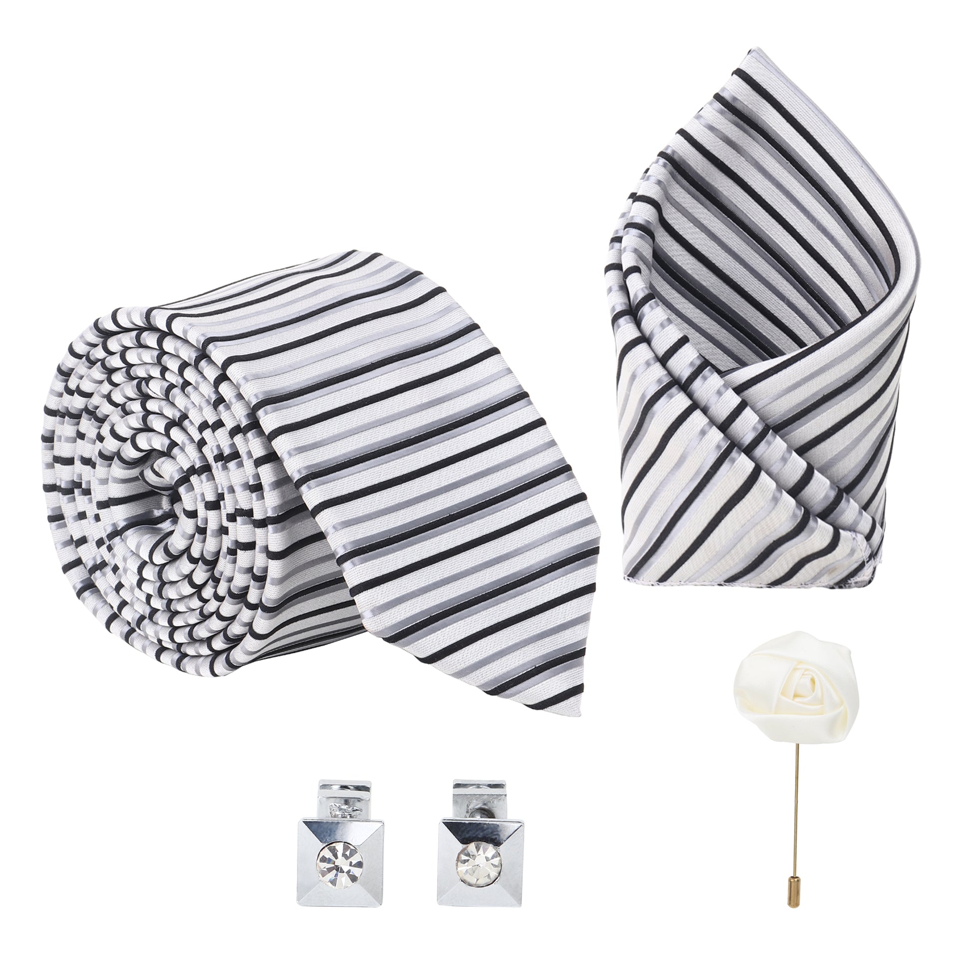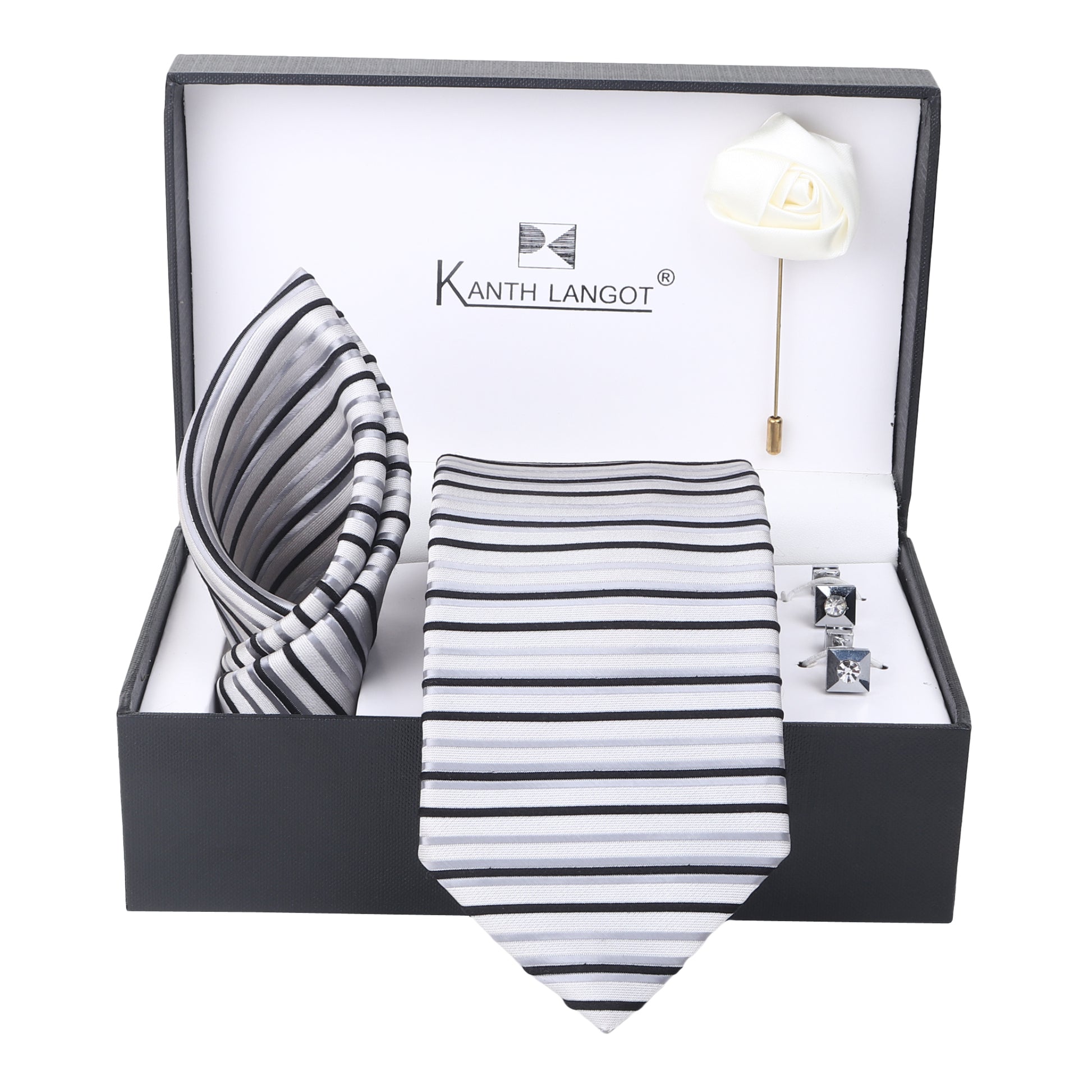 Kanthlangot Set of 4: White-Grey Striped Tie, Pocket Square, Crystal Cufflinks & White Lapel Pin in Gift Box