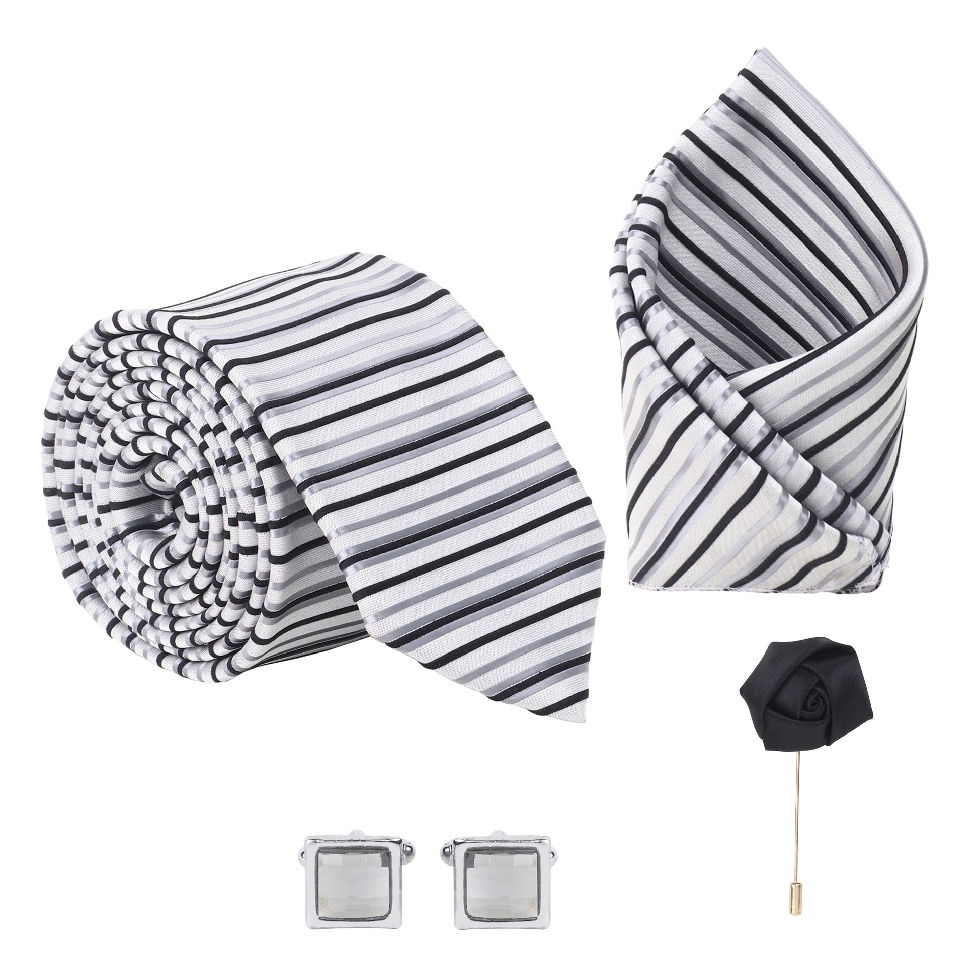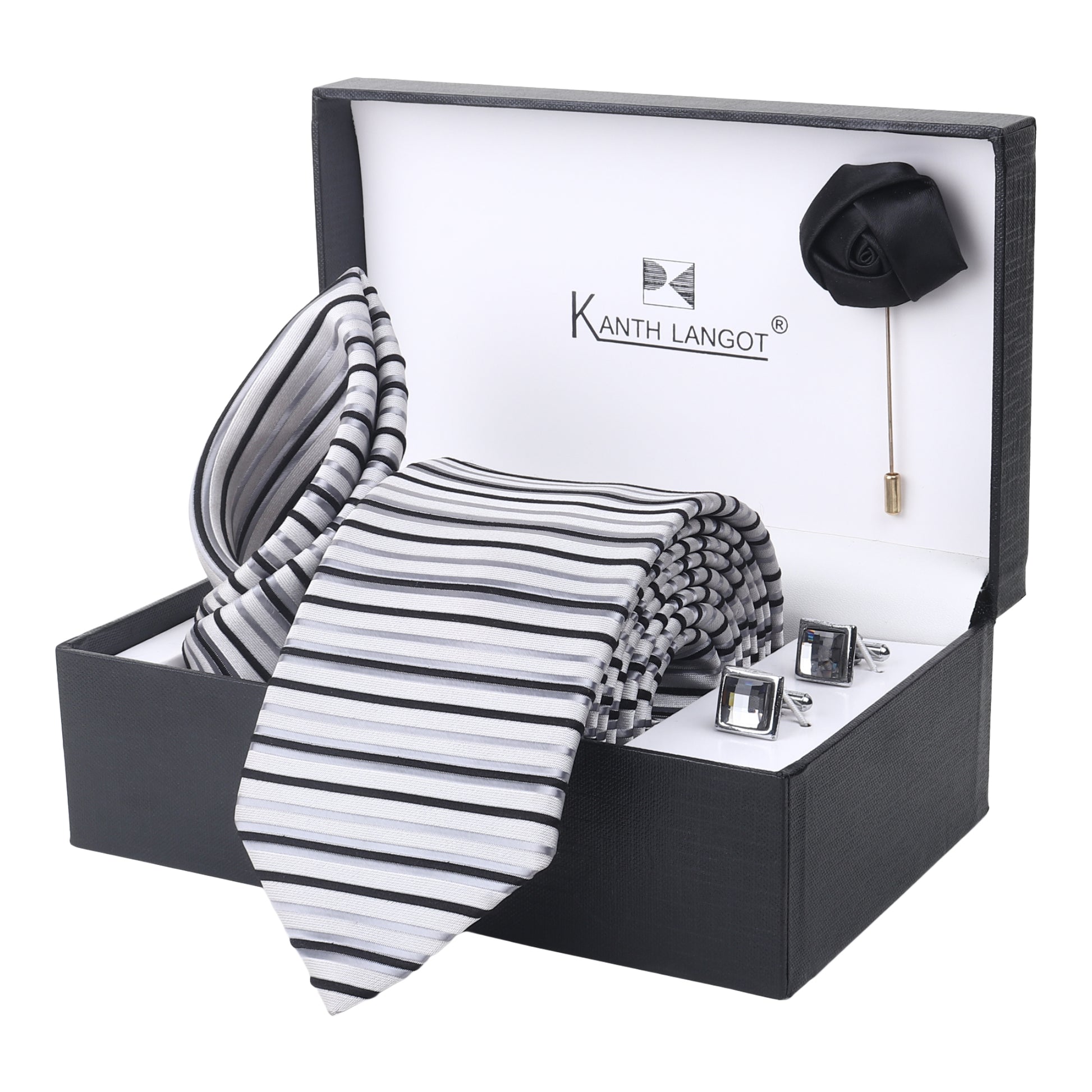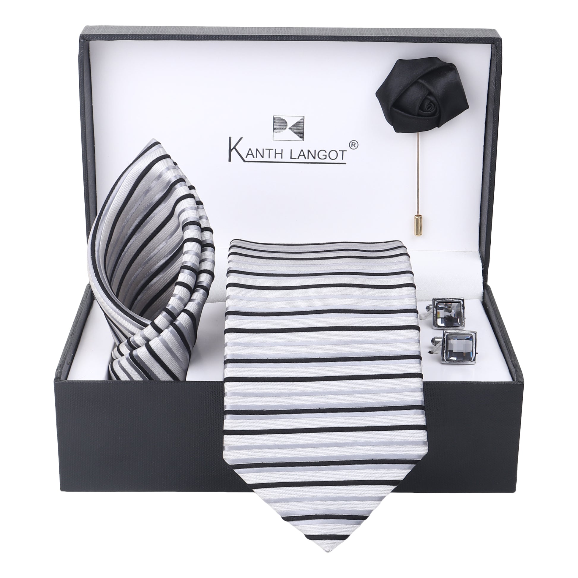 Kanthlangot Set of 4: White-Grey Striped Tie, Pocket Square, Black Lapel Pin & Crystal Cufflinks in Gift Box