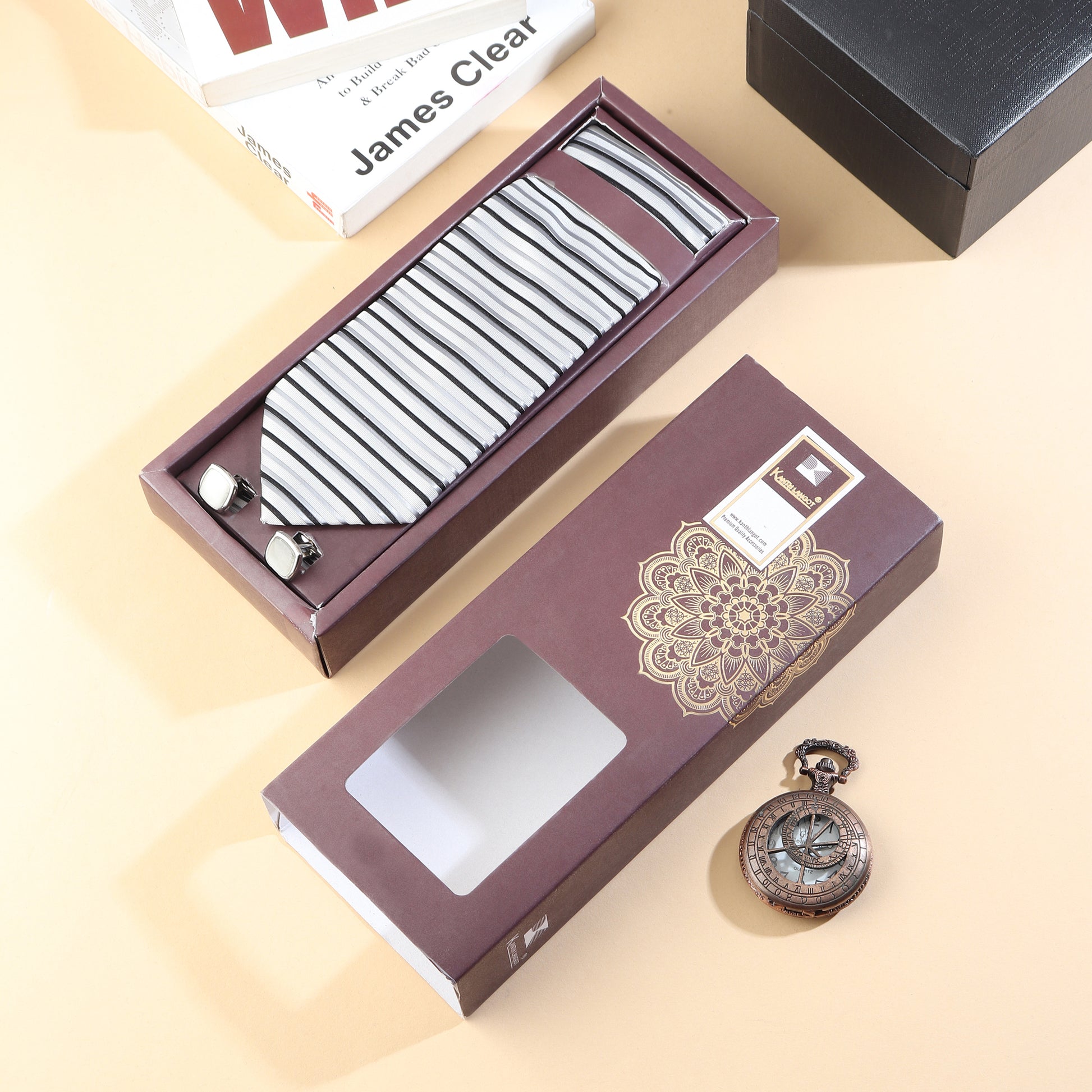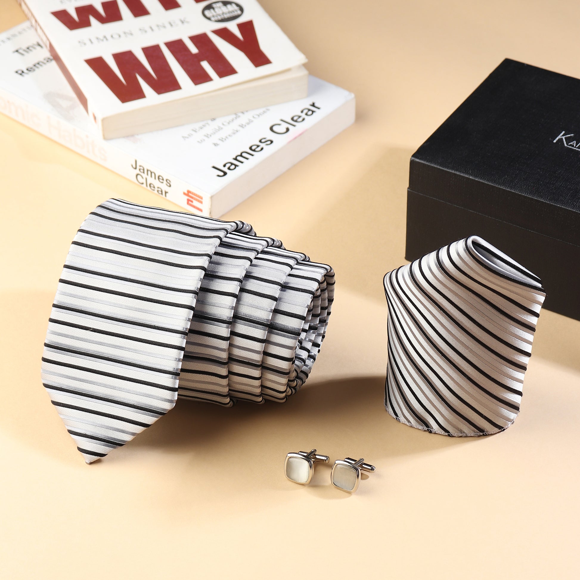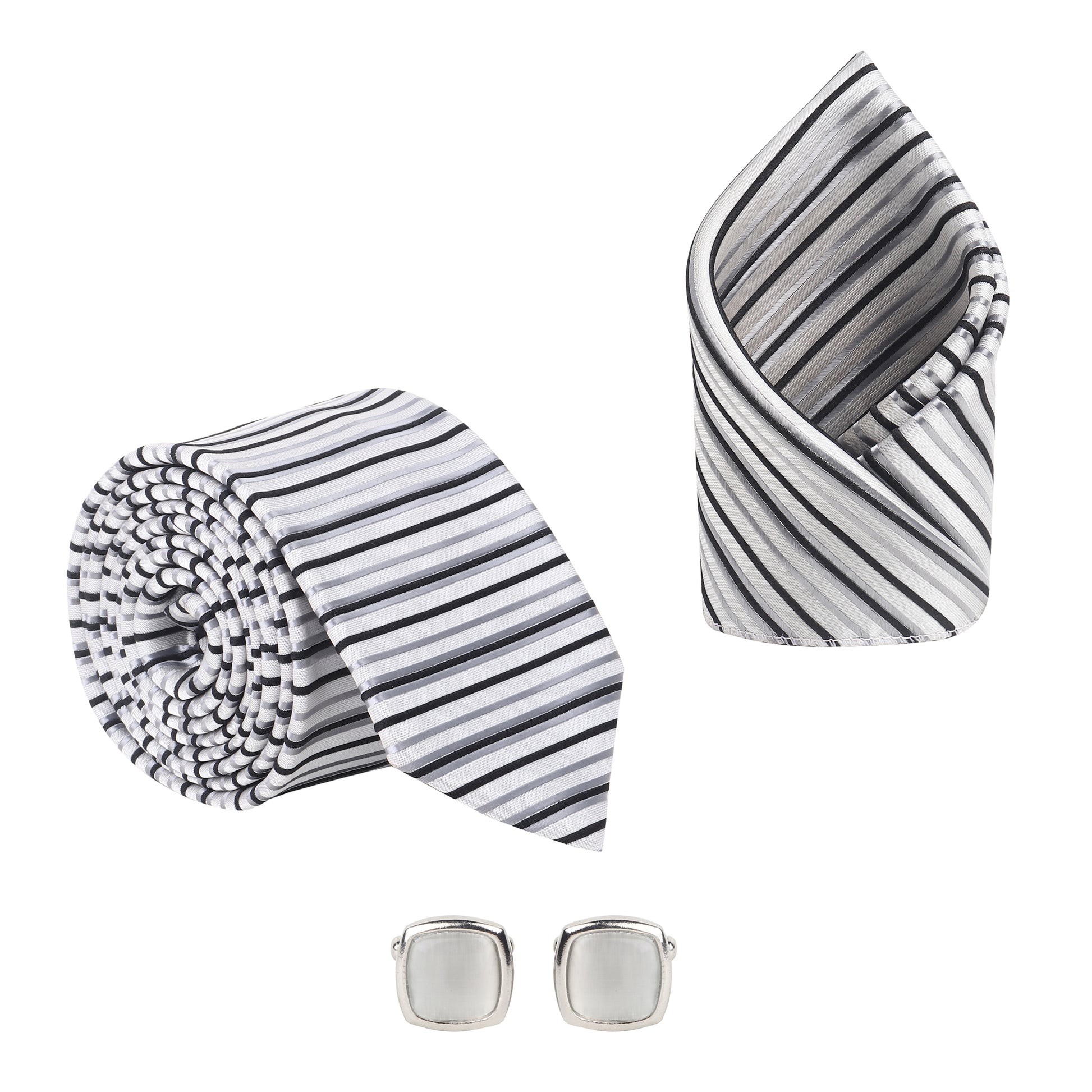 Kanthlangot men’s striped tie set with pocket square & silver crystal cufflinks. Ideal for weddings, corporate events, and sophisticated gifting.