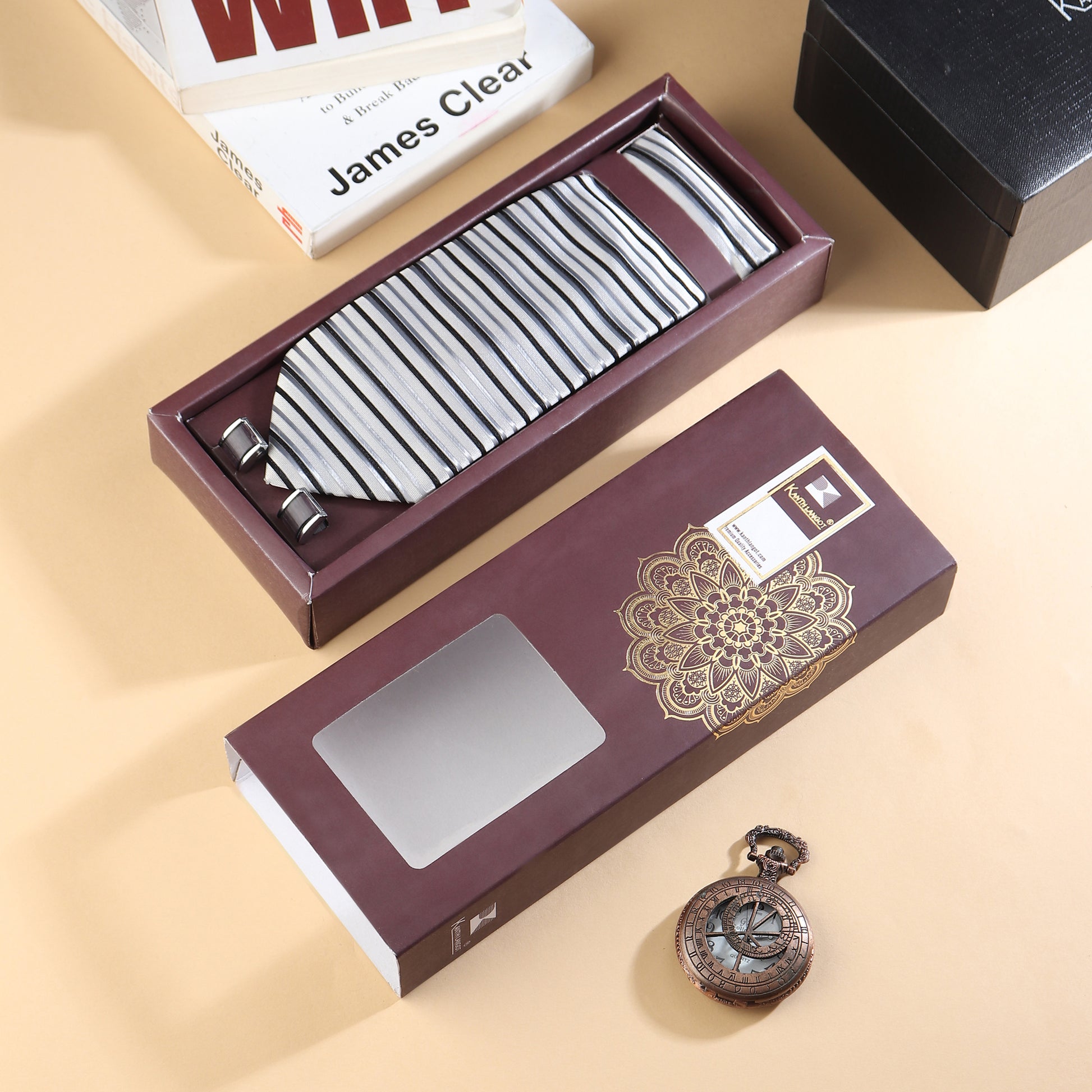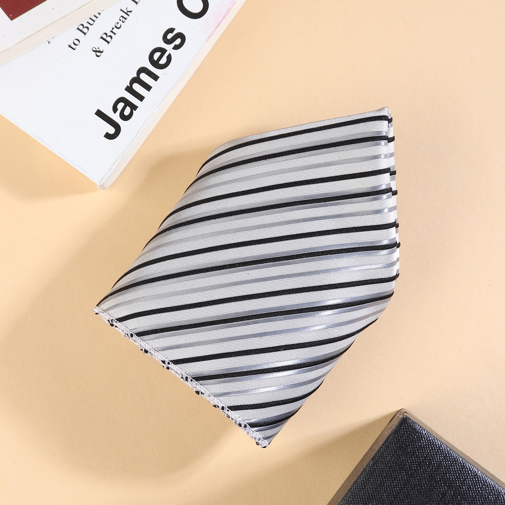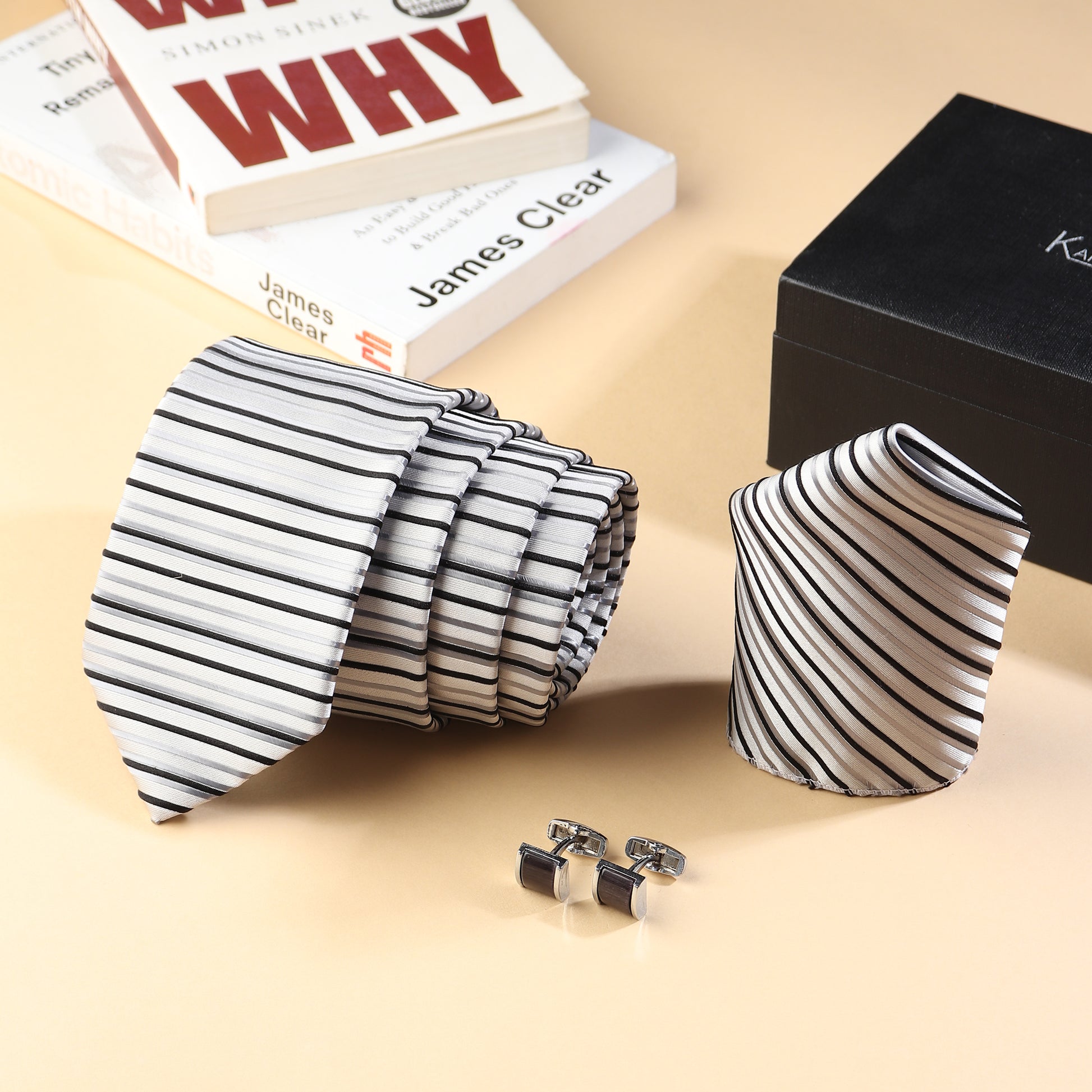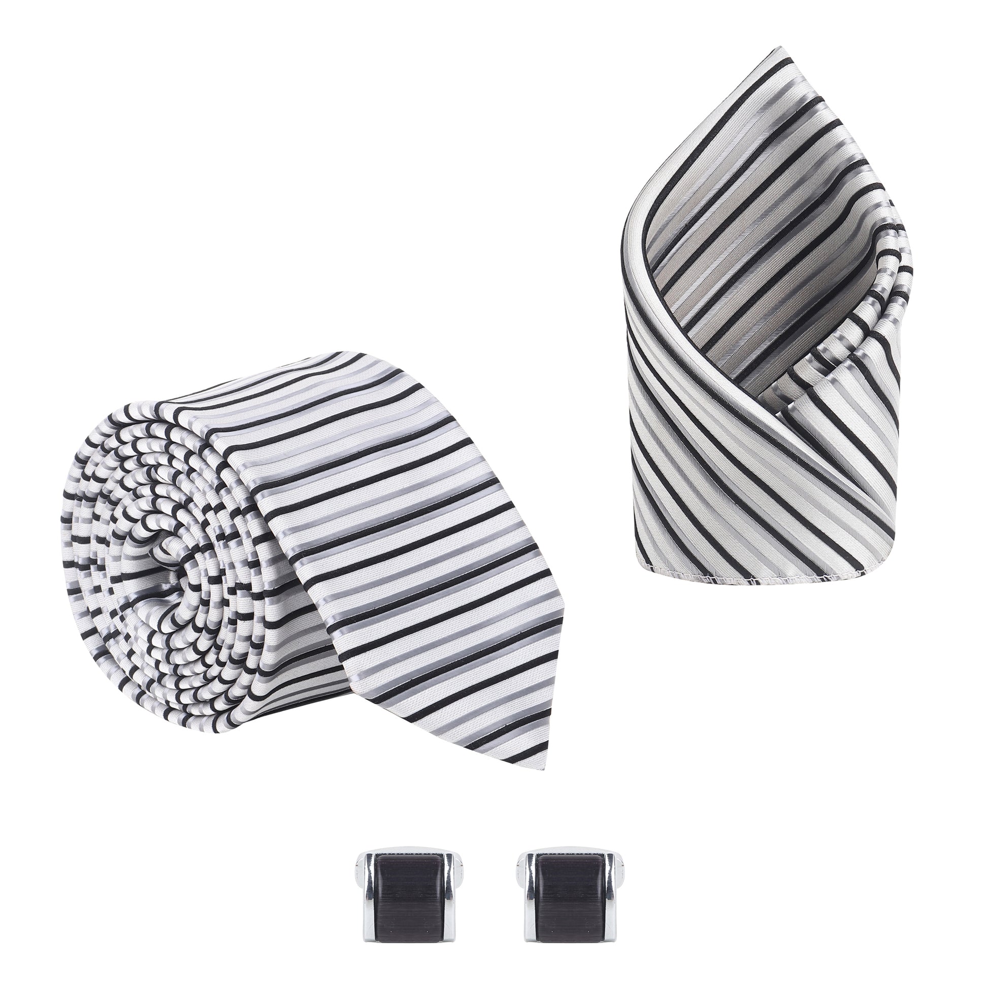 Kanthlangot Men’s 3-Piece Formal Set – Striped White, Grey & Black Tie, Pocket Square & Silver Cufflinks (3-Inch Necktie)