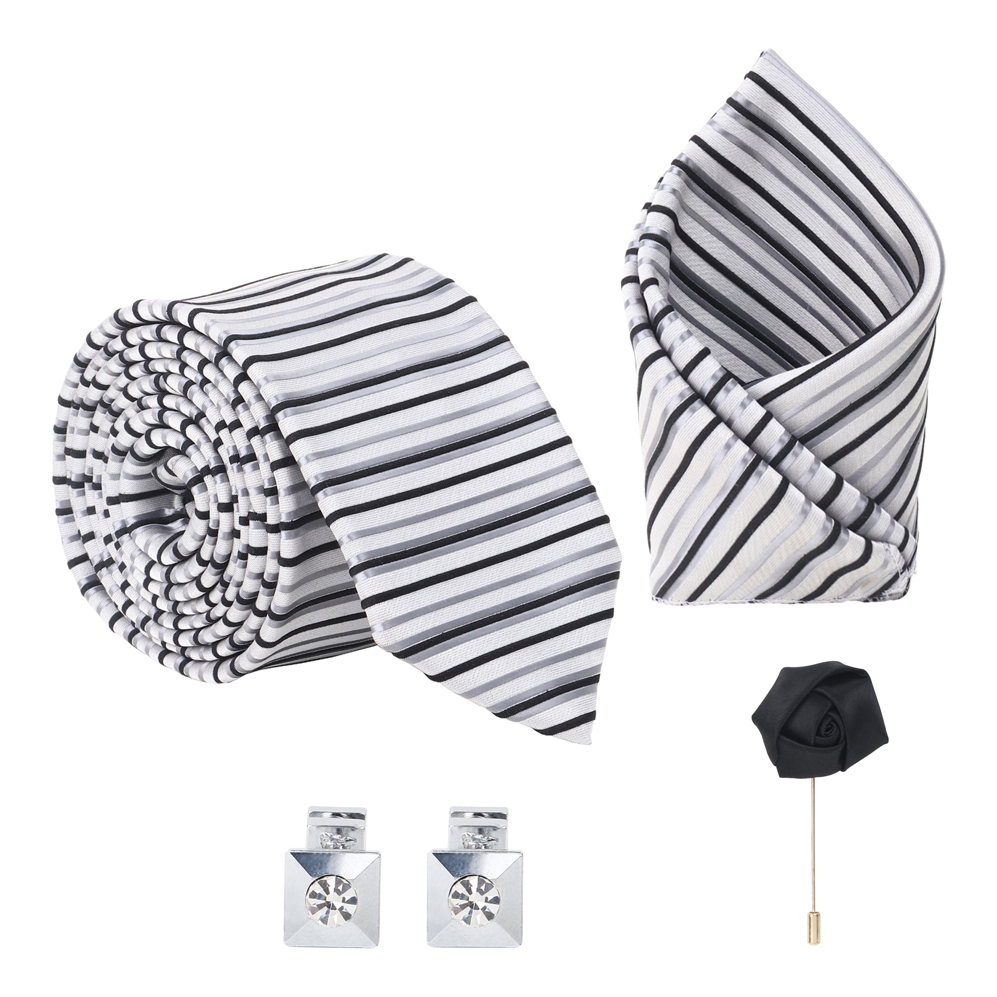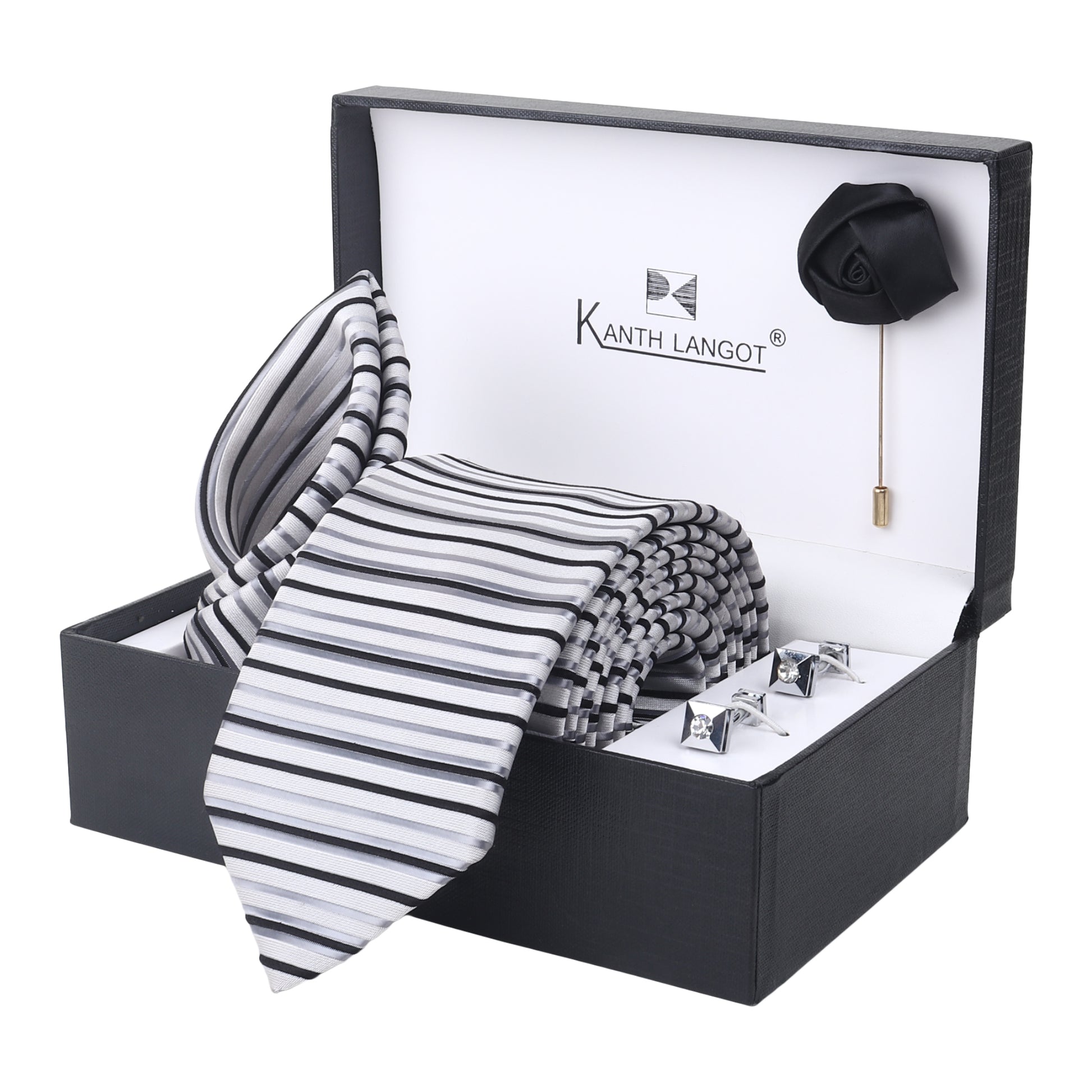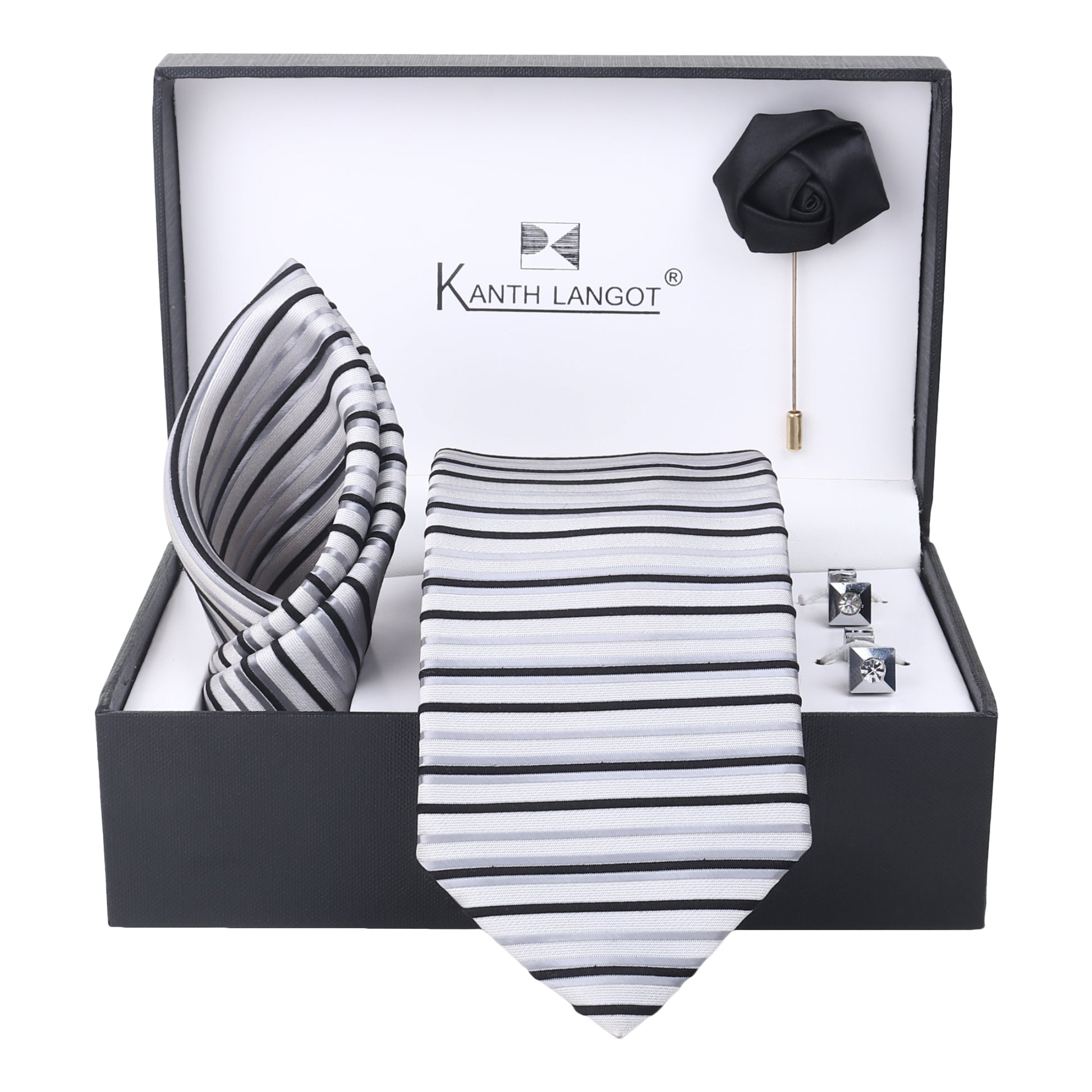 Kanthlangot Set of 4: striped tie, pocket square, black lapel pin & metallic black cufflinks. Gift-ready, stylish, and modern for every occasion.