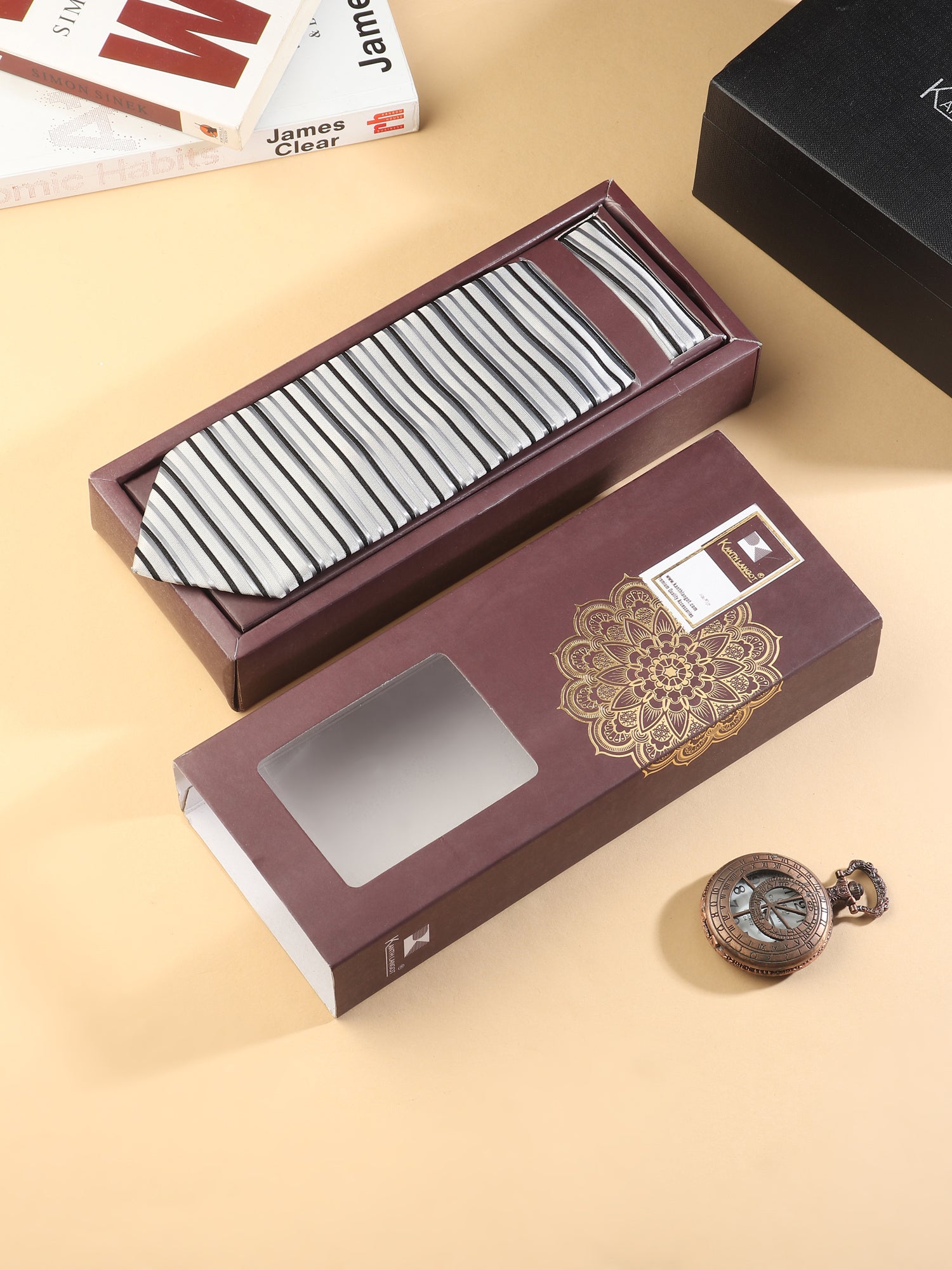 Step into timeless style with the Kanthlangot White & Silver Stripe Necktie & Pocket Square Set. Featuring a refined palette of white, silver, and black stripes, this duo adds a clean, modern edge to your formal or semi-formal wardrobe. Perfect for both day events and evening affairs, this set makes a lasting impression.
