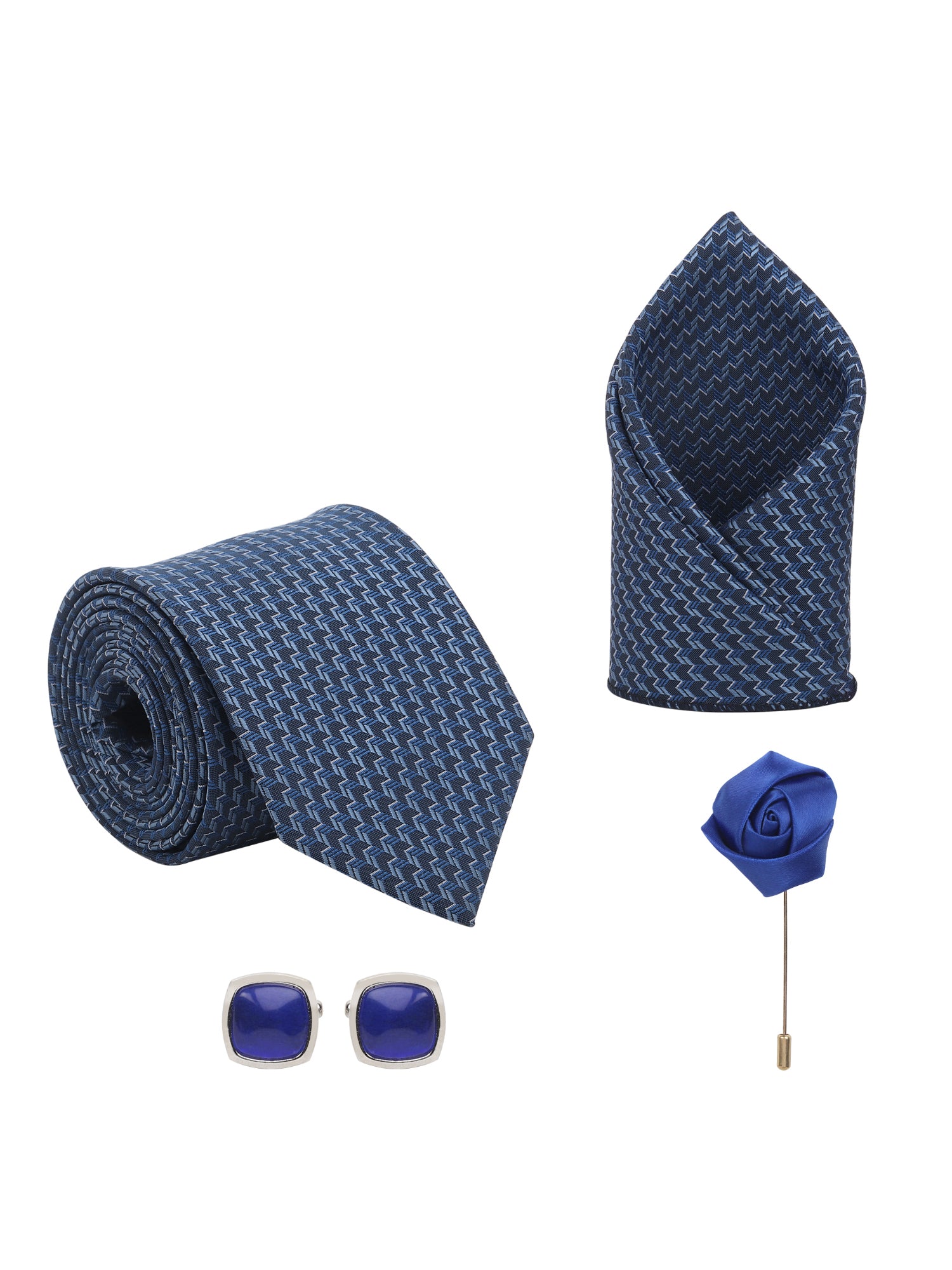 Kanthlangot Zigzag Navy Tie Gift Set with Pocket Square, Square Blue Cufflinks & Lapel Pin