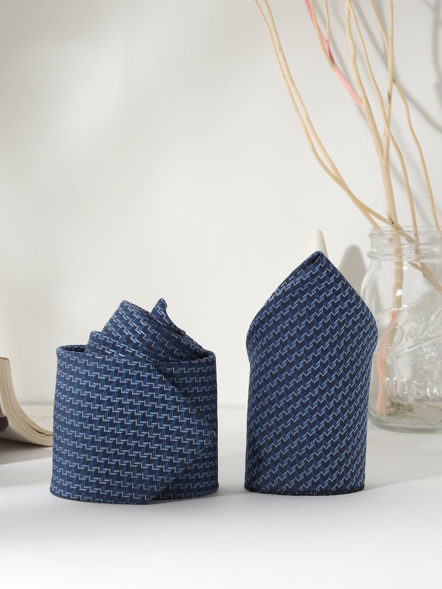 Make a powerful impression with the Kanthlangot Zigzag Navy Tie Gift Set, an elegant 4-in-1 ensemble crafted for refined taste. This set includes: