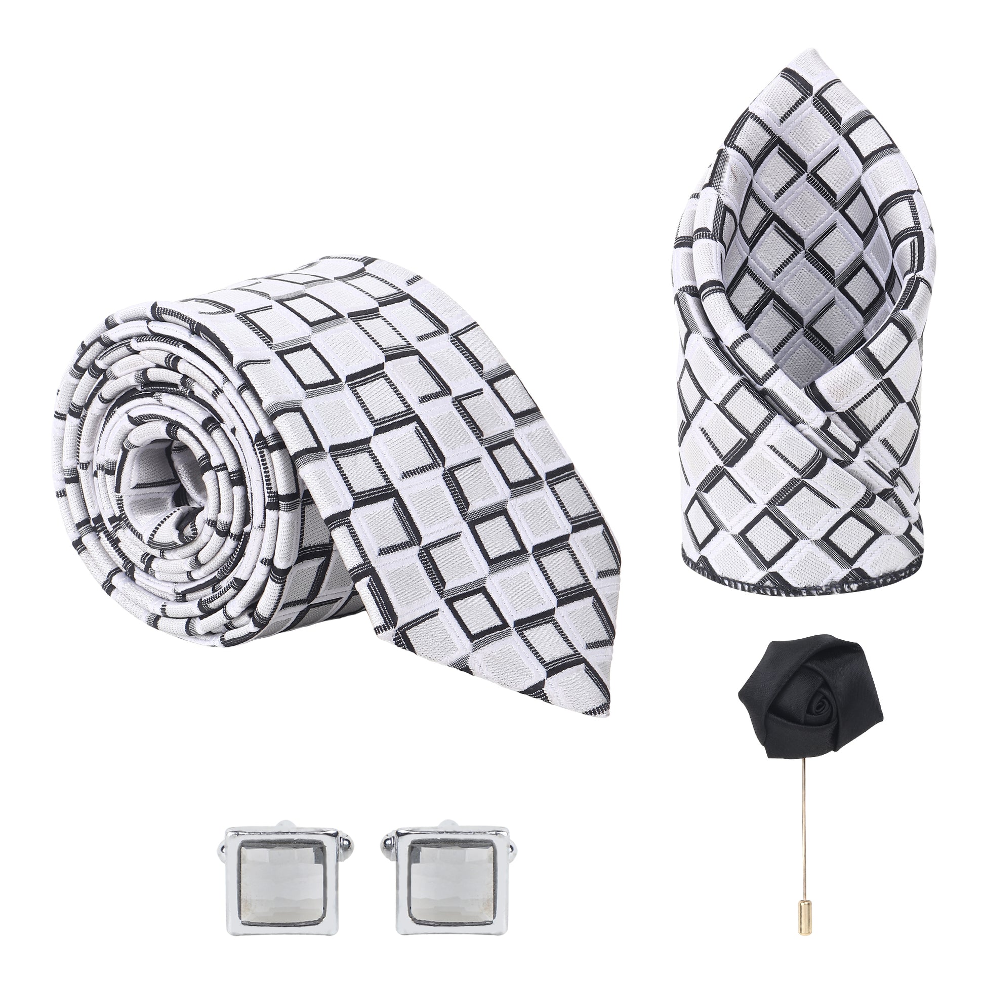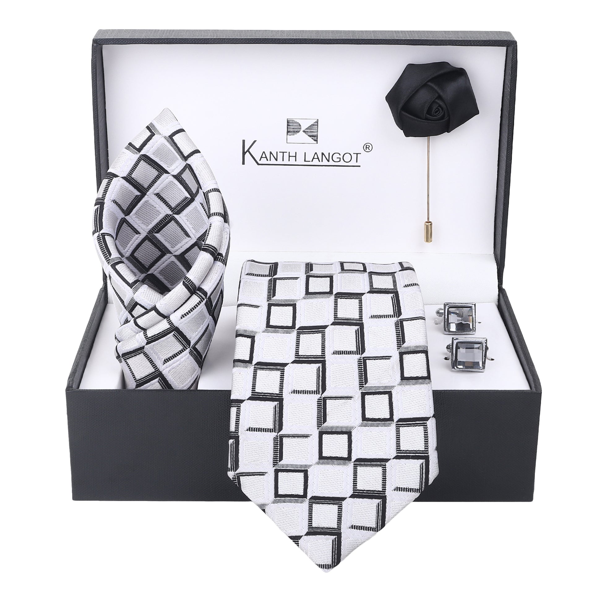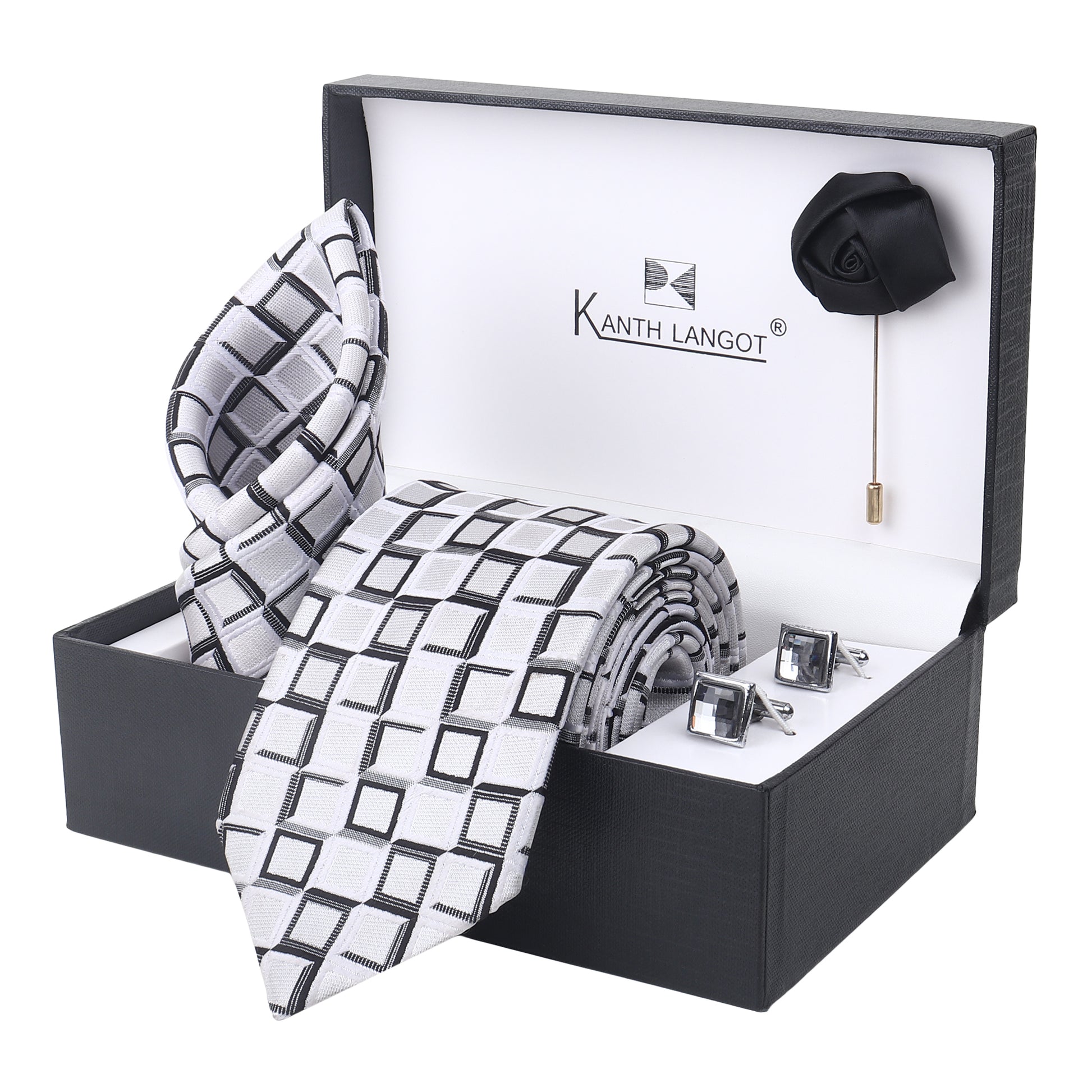 Kanthlangot Silver Grid Checkered Necktie Gift Set – Tie, Pocket Square, Cufflinks & Lapel Pin