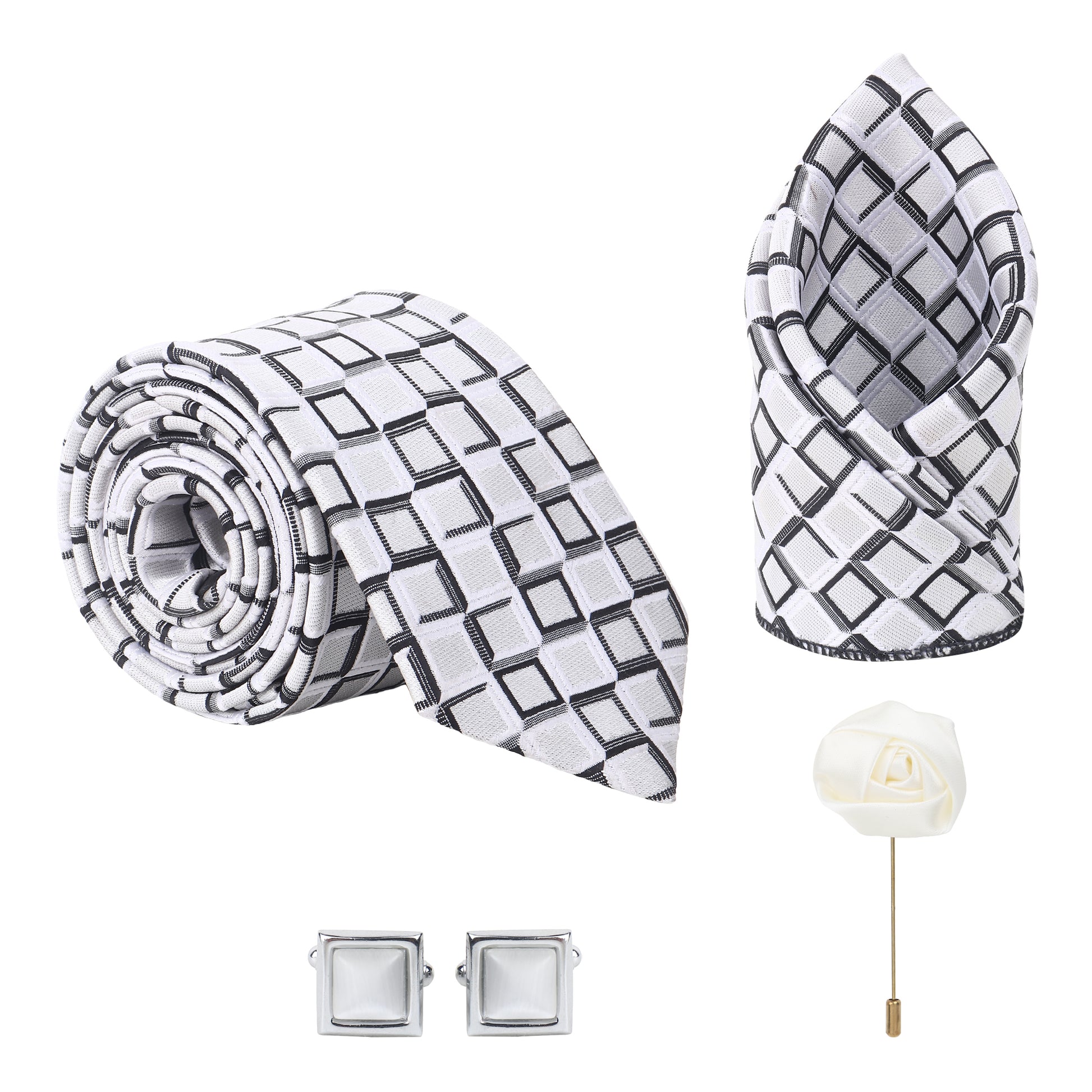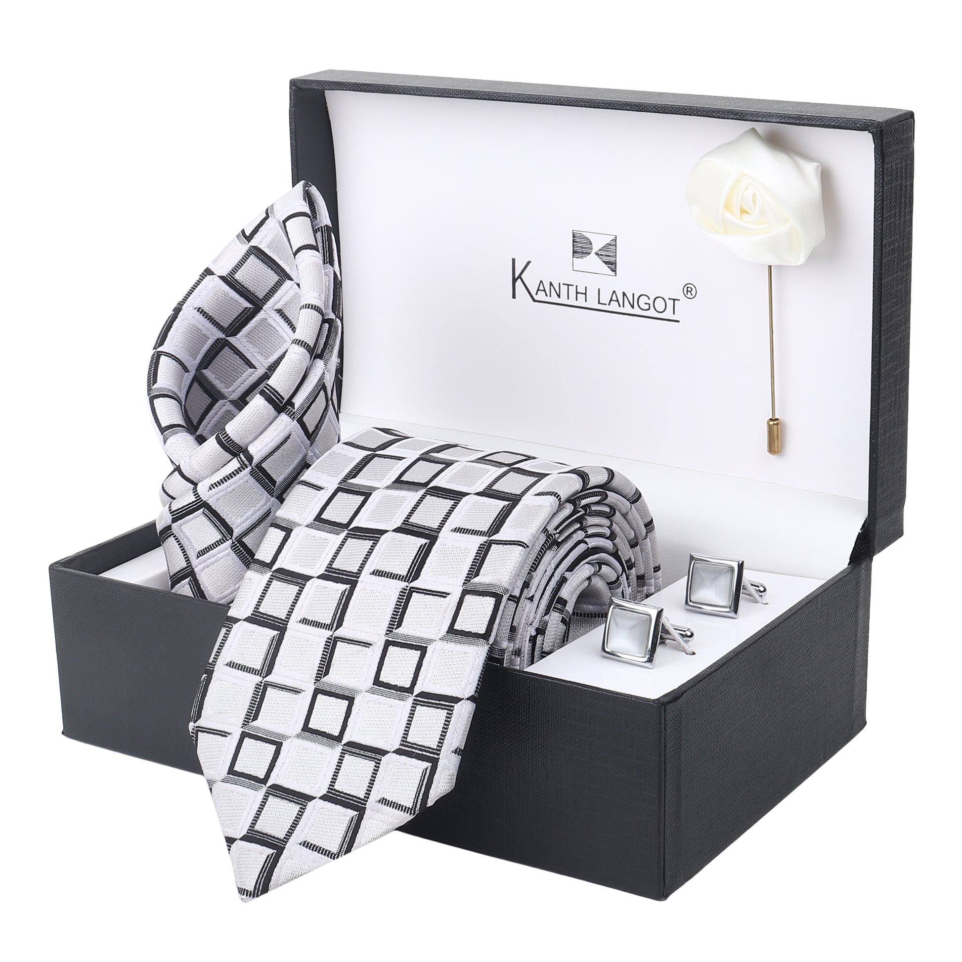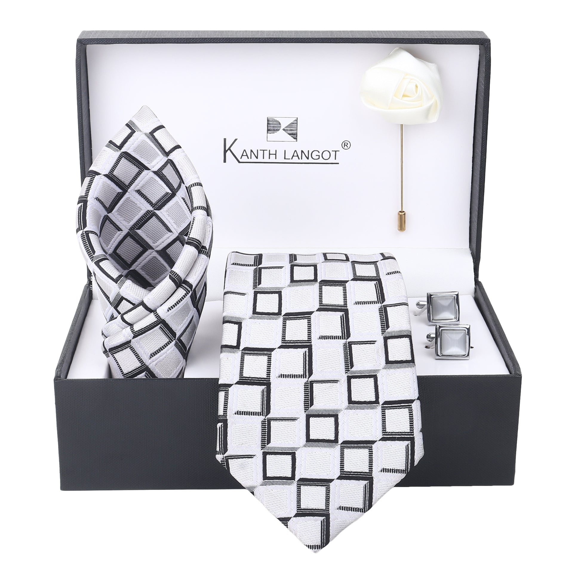 Kanthlangot White & Black Checkered Tie Set with Silver Cufflinks, Pocket Square & Lapel Pin