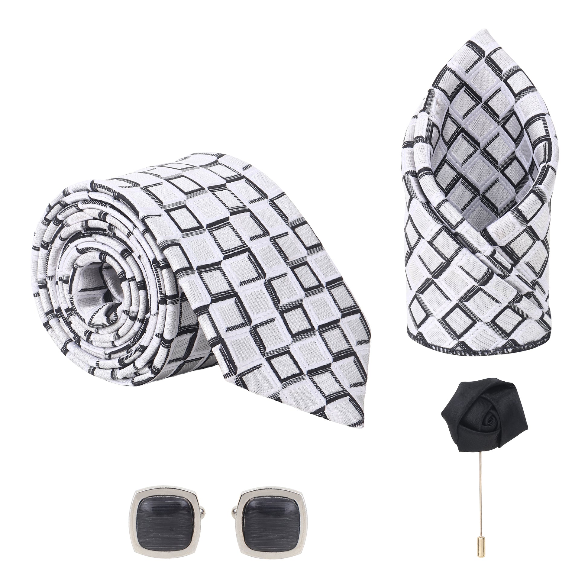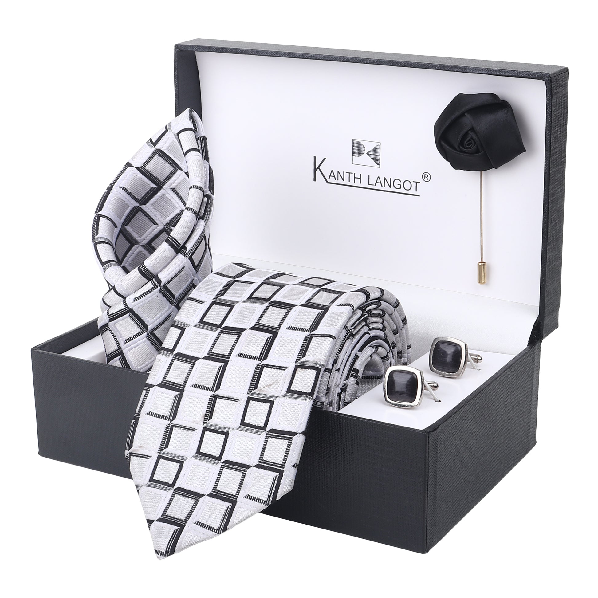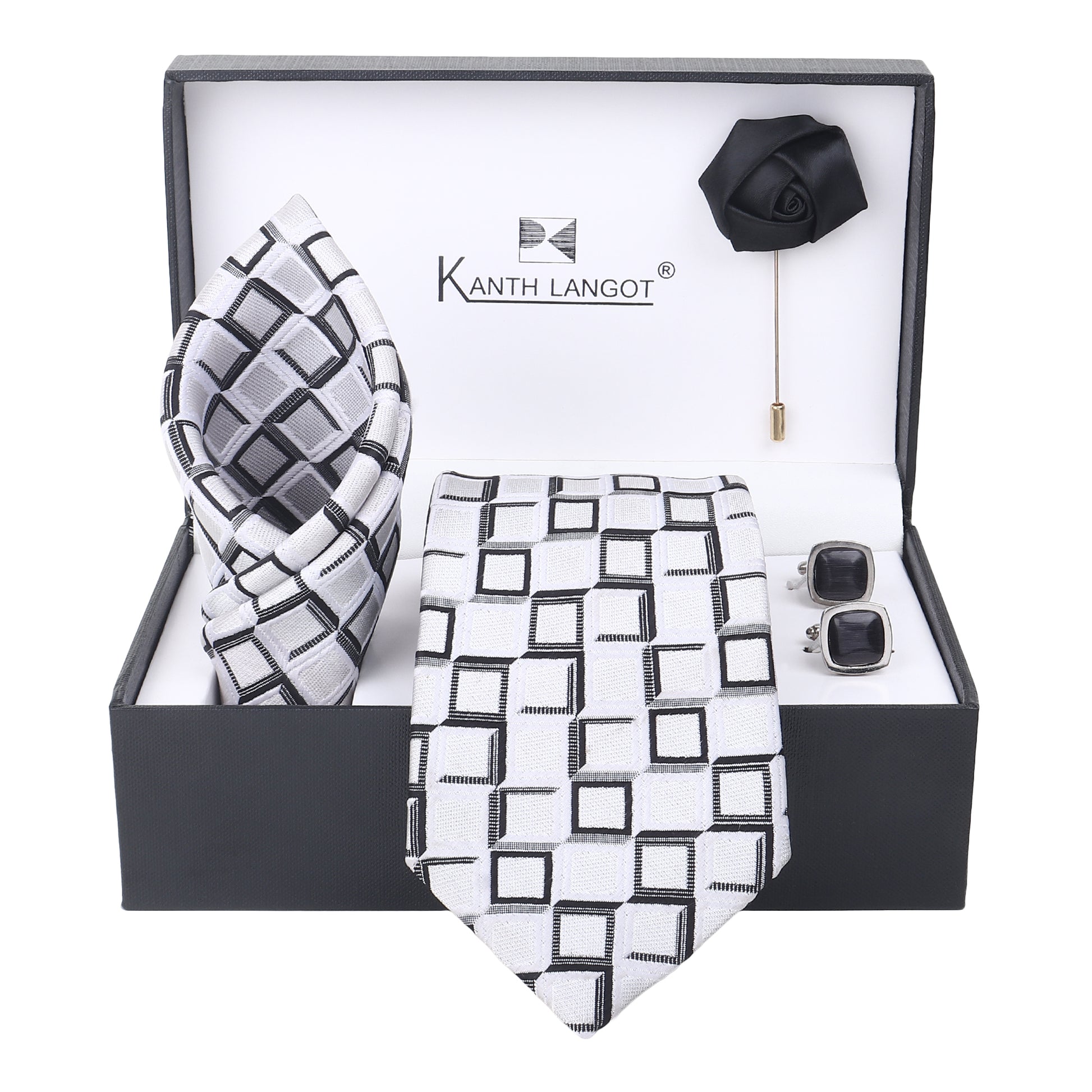 Kanthlangot White Square Check Tie Set with Black Border Cufflinks