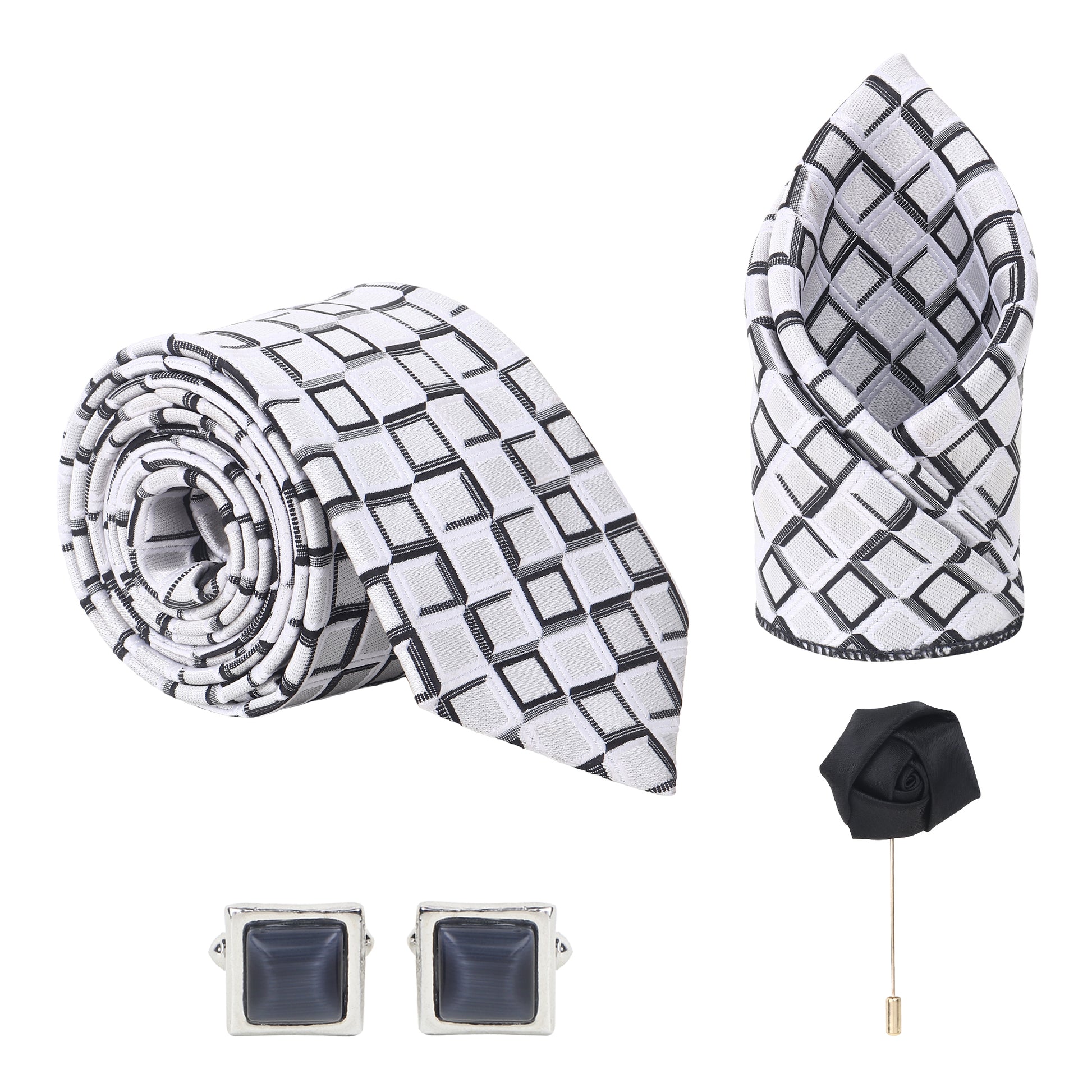 Kanthlangot White Grid Tie Set with Black Square Cufflinks & Rose Lapel Pin
